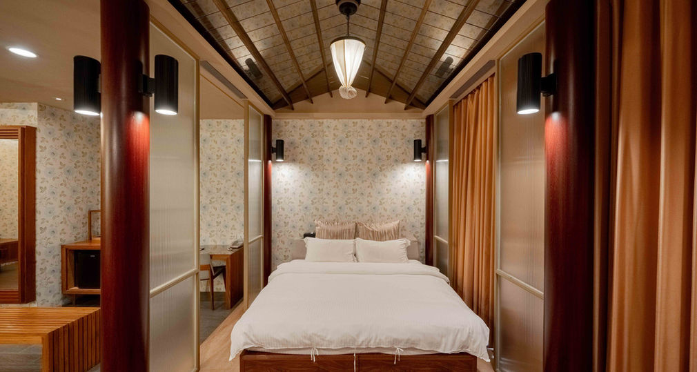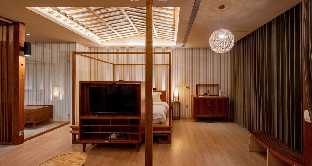 房間以清朝為設計主題,實木家具展現清代四柱結構的典雅與穩重,天花板的木格設計增添歷史氛圍。整體風格保留傳統特色,同時融入現代簡約與舒適感