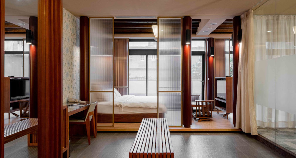 房間以木質材料營造溫暖氛圍,半透明屏風讓光線通透,簡約設計使空間寬敞整潔。大窗戶引入自然光,融合東方優雅與現代簡潔的美感。